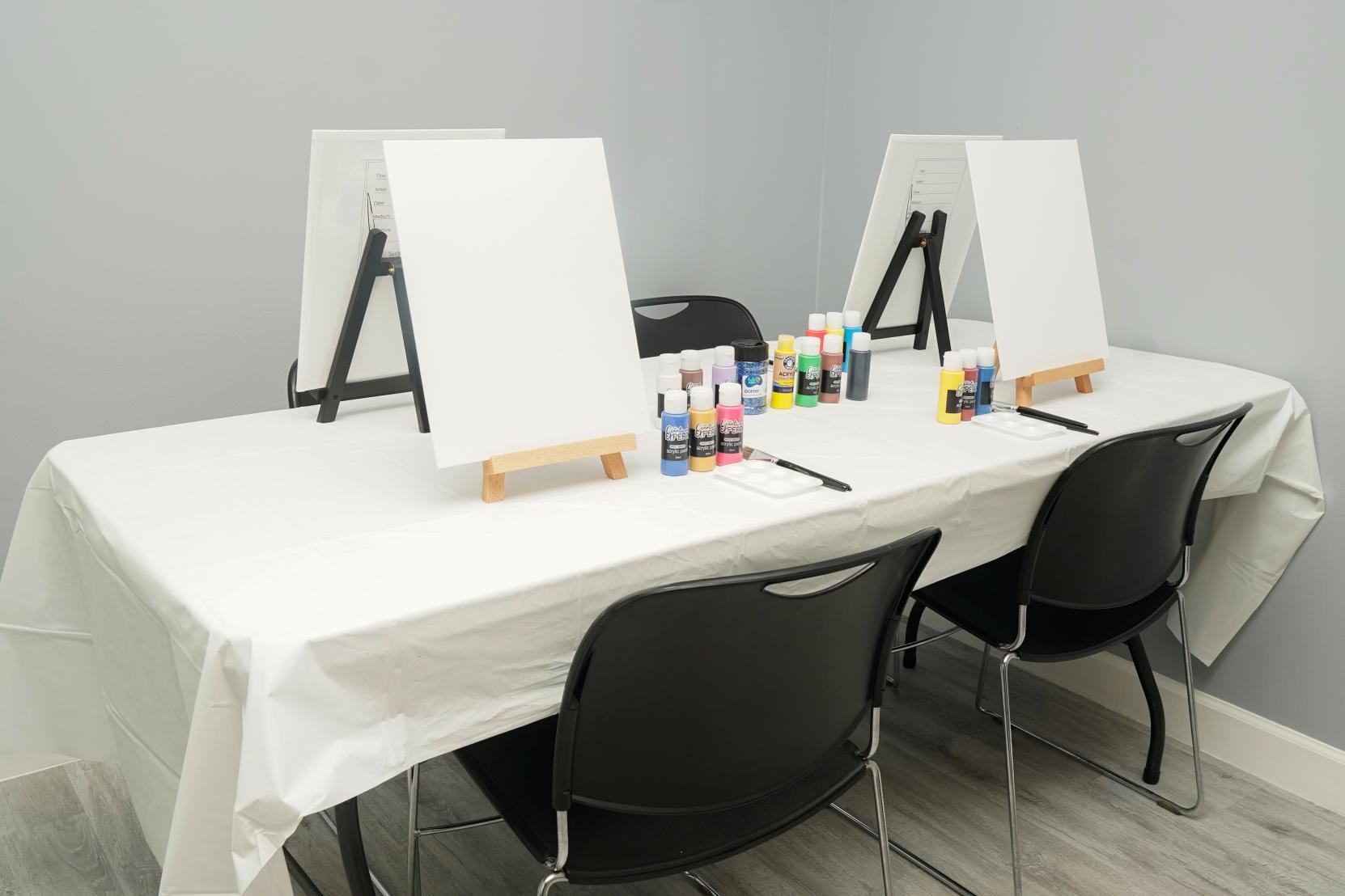 Each session includes a 11x17 canvas or canvas panel, paint, brushes, aprons, water cups, and guided instruction. For private and birthday bookings, we also include a photo booth setup for fun memories.
